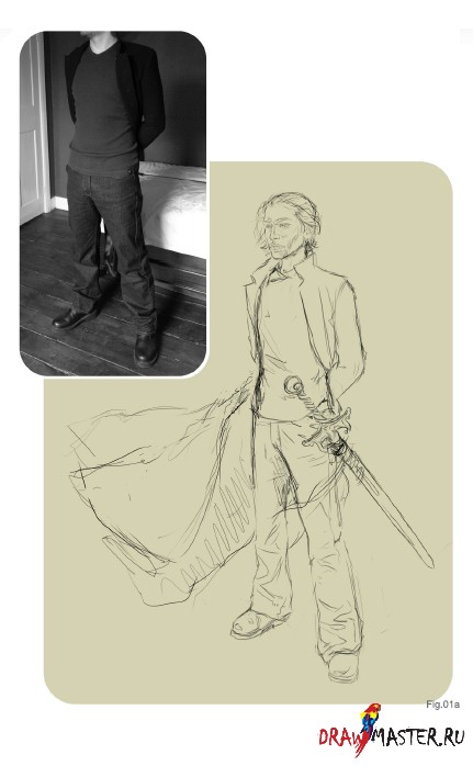 БИТ ЗА БИТОМФИГУРА (рис. 01)Я использовала фотографию своего мужа для создания наброска позы, а также для грубой текстуры одежды (рис. 01а). Как видите, у персонажа изначально был меч, который я срисовала со своего меча и подогнала под данный рисунок. В процессе рисования я решила, что меч вовсе не нужен, поэтому я его просто убрала. Лицо я нарисовала сама. На самом деле это лицо было создано для совершенно другой работы, которую я так и не закончила, но мне оно слишком нравилось, чтобы позволить ему затеряться в глубинах жесткого диска, так что я просто скопировала его и вставила в свой эскиз.