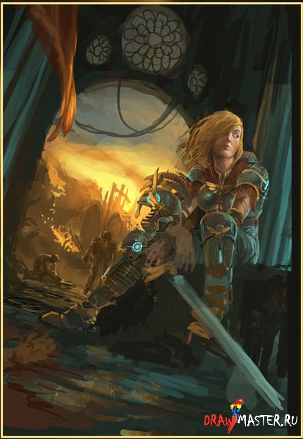Изначально я думал о войне и битве, и яркой истории картины, и не хотел лишать зрителей такой картины. Я создаю задний фон. Мне хотелось сделать все в оранжево-зелено-голубой палитре, поэтому я решил, что надо поместить героиню где-то внутри здания, но при этом, чтобы огни с улицы освещали ее со спины. Возле прорванной арки, или что-то типа того. Она оглядывается по сторонам, пока ее друг из ее команды уже снаружи. Возможно, он кричит ей, что следует торопиться. Но она устала. Теперь название картины стало очевидным.