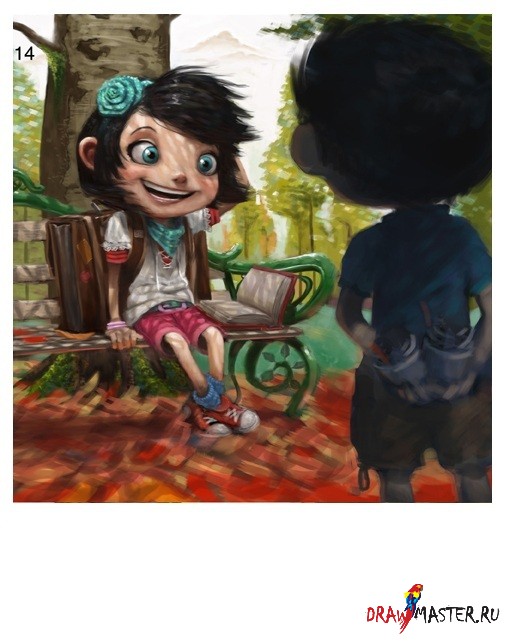 Шаг 17Все сводится к детализации в зависимости от того, насколько мы любим детализировать. Я не хочу тратить на этот рисунок слишком много времени, поэтому я оставлю эти мазки кистью нетронутыми. Они хорошо вписываются в общий вид, тем более они уже выполнили свою задачу в рисунке. Все что мы будем делать теперь это формирование общего вида рисунка, как например надпись в книге. Там написано - "Сказка" (на самом деле вы не можете это прочитать), но надпись была добавлена для того, чтобы заставить зрителя думать: Напоминает ли мальчик в голубой футболке голубого принца из сказки? Романтичная ли особа эта девочка? Как часто она читает?... Подобные размышления доставляют еще больше удовольствия от просмотра.