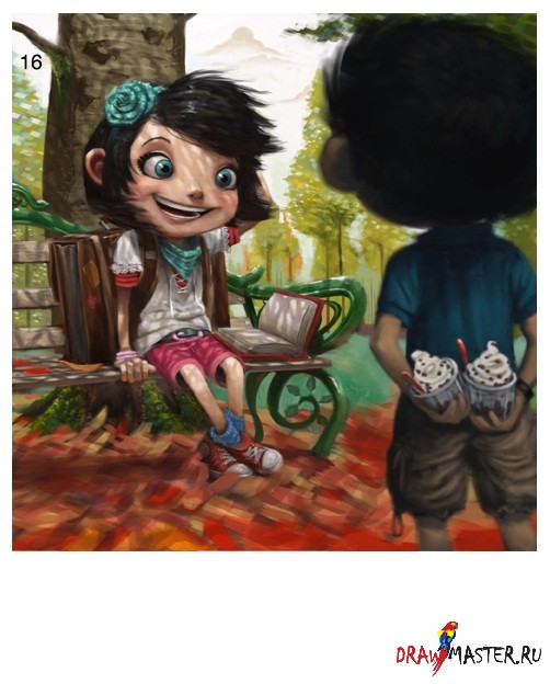 Шаг 11Помните я упоминал ветер? Я сделал его более заметным благодаря листьям. Я также детализировал обувь девочки - теперь на ней кеды Converse (потому что я сам их часто ношу! хахаха). Продолжая добавлять все новые и новые детали, я придал форму ручкам у лавки и заменил подарок на две порции мороженного, что должно вам подсказать о намерениях мальчика (:р)
