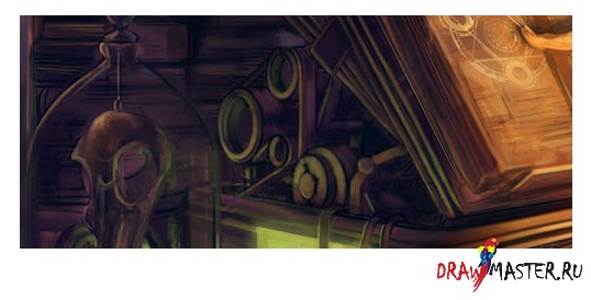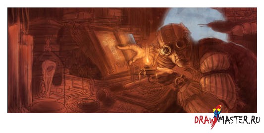 После беседы с некоторыми друзьями и переоценки некоторых вещей, линии претерпели довольно большую трансформацию. Пробирки в чемоданчике теперь стали переносным генератором, у героя пропала шляпка, вместо которой появилась кожаная шапочка, за спиной у него появилась карта с тахометром, модель воздушного корабля упала с потолка, а кусок глиняной плитки отломился и упал на открытую книгу на столе. Все эти детали рассказывают историю, делая подсказки зрителю о том, кем является главный герой и почему он так важен. Это картина довольно технического характера, так что надо убедиться, что все добавленное было добавлено не спроста, иначе все будет не так. Не бойтесь вырезать целые отделы картины. Этого не должно случиться, если мы правильно подготовили набросок и фото-образцы, но если уж что-то пошло не так, надо действовать.