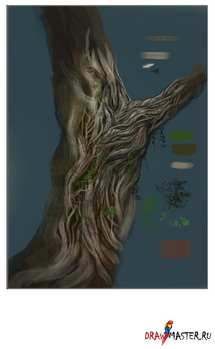 Я дорисовал побольше корней и добавил улучшенную текстуру дерева (см. верхний правый угол) при помощи круглой кисти с высокой жесткостью.