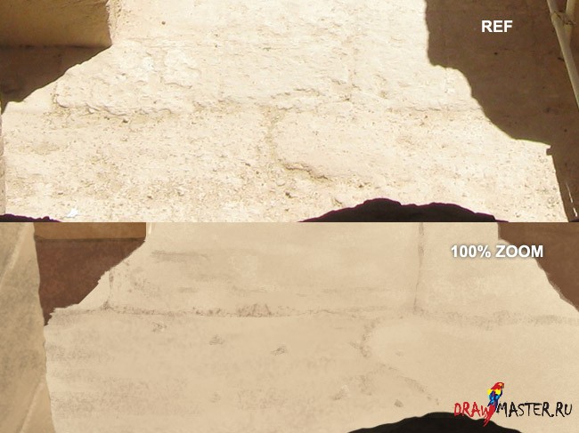 ШАГ 4: Проработка скальной/каменной текстурыИзвините, что я не представил вам больше промежуточных картинок для этого урока, но взамен у меня есть увеличенный на 100% масштаб моего графического рисунка и нашего фото-образца под ним, на котором можно увидеть, насколько детализированной должна быть поверхность, чтобы придать рисунку реалистичный вид при уменьшенном масштабе.