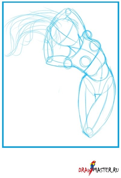 Что это за линия, которую я только что нарисовала? Это линия середины тела. Тело моей героини имеет немного изогнутую форму, поэтому линия середины тела также изогнута. Если быть анатомически точными, то линия живота (первая после линии груди) должна находиться на расстоянии примерно равном длине одной головы от сосков, и эта последняя маленькая линия (линия паха) должна располагаться на расстоянии равном длине одной головы от пупка. Тем не менее, я рисую свою героиню в соответствии с перспективой, так как ее тело изогнуто в сторону фона (ее голова расположена ближе по направлению к нам чем ее ноги), поэтому в моем рисунке - линии короткие.