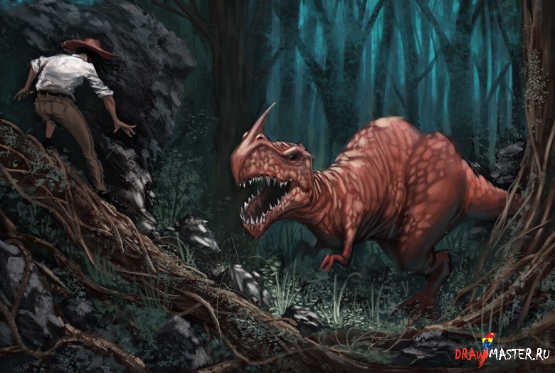 ЗАВЕРШЕНИЕЯ решил, что нужно было сделать что-то, чтобы немного изменить облик динозавра, поэтому я подрисовал ему на спине и голове рога. Я продолжил повсюду добавлять детали, особо не увеличивая масштаб изображения, чтобы не терять общую картинку из вида. Я добавил заднего освещения человеку, в котором заиграли некоторые краски из окружения. С этого момента начинается выискивание мелких изъянов, изменение и добавление деталей, организация определенных областей так, чтобы избежать образование касательных линий, а также затемнение и осветление некоторых зон с целью выделения этих зон и объектов, находящихся в них. На этом, думаю все. Надеюсь, этот урок окажется для вас полезным и чему-то вас научит. Пишите , если возникнут какие-либо вопросы. Если вы знаете другие способы рисования подобных картин, я буду рад их познать. Спасибо за чтение!