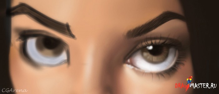 70% до конца процесса). Начинаем постепенно рисовать от темного тона к светлому, в полной мере используя серый фон, оттеняя его лишь слегка голубовато-серым оттенком на темных участках глазного яблока. Всегда оставляйте прорисовку самых ярких областей на конец процесса (в данном случае я откладываю прорисовку областей света на завершающую часть рисования данной области). Затем я выбираю цвет глаз, и далее рисую зрачок. Очень аккуратно прорисовываем кожу вокруг глаз, периодически снижая уровень