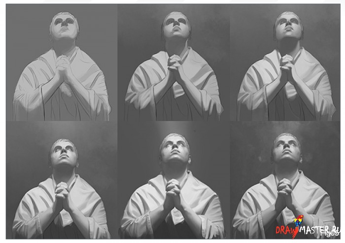 СВЕТОТЕНИДля меня светотени – один из наиболее важных аспектов рисунка. Если ваша светотеневая схема сильна, вы получите желаемый результат вне зависимости от цветовой схемы, которую вы выберите. Данный рисунок я решил начать с оттенков серого. Это поможет мне сконцентрировать свое внимание только на светотени еще до начала работы с цветом. Первым делом вы должны четко сформулировать свою светотень, не важно, работаете вы в цвете или нет. Сделайте так, чтобы изображение максимально выглядело трехмерным, и чем раньше вы этого эффекта добьетесь, тем лучше. Начните со среднего тона и двигайтесь от этой исходной точки. Я работал в основном большой твердой кистью, в некоторых местах складок применял точечную кисть. Вы можете скачать все мои кисти для рисования в конце урока.