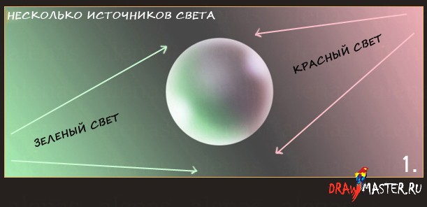 1. Мы вернулись к шару, который в данном случае выполнен в сером цвете металика. Здесь два разных источника – зеленый слева и красный справа. Что касается бокового освещения, каждый свет отбрасывает свои цвета на шар, тогда как середина шара остается такого же цвета, какого была – серый металик.