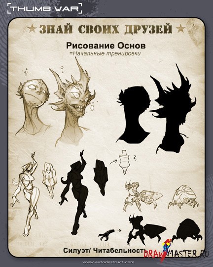 Читабельность // Читабельность появляется не из просто жирно обведенного силуэта, но из умелого распределения деталей. Старайся располагать каждую деталь прицельно, в ключевых точках. В миниатюрах, чем больше информации ты заложишь в рисунок, тем проще будет прорабатывать его в дальнейшем. Однако сосредоточься на больших штуках; более мелкие детали можно просто подразумевать, не прорисовывая – их всегда можно добавить в будущем.