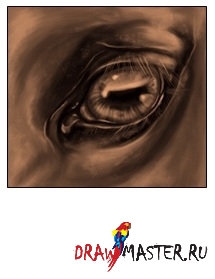 5. Теперь перейдем к более интересной части :) Маленькой, полужесткой кистью (непрозрачность (opacity) - 30-40%) я определяю окончательный контур глаза, делая тени более глубокими, а линии более четкими и чистыми.