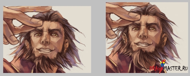 Итак, на рисунке слева я добавил больше темного цвета. Надо быть внимательным, чтобы опять не испортить все, затемняем только самые темные участки.