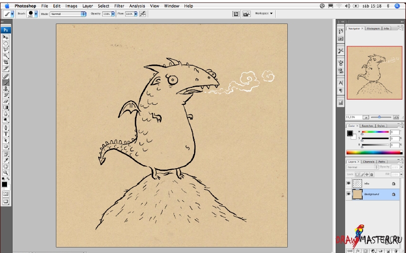 По завершении обводки рисунка тушью я подумала, что будет лучше, если придать фону текстуру бумаги. Присмотревшись к своей папке с текстурами (в которой я собрала немереное количество разных текстур и шаблонов, как скачанных из интернета, так и созданных своими руками), я обнаружила довольно приятную текстуру тонированной бумаги (и подозреваю, что это был отсканированный конверт из оберточной бумаги) и поместила его на фон. Если у вас есть сканер и/или цифровая камера, всегда очень полезно фотографировать всякие разные мелочи, или создавать что-то своими руками. Даже если их едва заметно, они всегда придают изображению изюминку и делают их… как бы сказать, менее цифровыми! Теперь, когда фон уже не белый, я включаю функцию Блокировать прозрачные пиксели (Lock Transparent Pixels) на слое с контуром и меняю цвет дымка, идущего изо рта дракона, на белый.